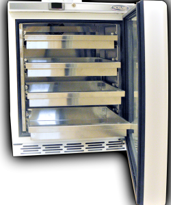 用于血庫的自動除霜冰箱中的四個滑動抽屜具有88個血袋的組合存儲容量。 鋁內(nèi)部易于清潔,基座安裝的強制空氣前端呼吸制冷系統(tǒng)允許機柜封閉在兩側(cè)。 其空冷冷凝裝置配有過濾網(wǎng),也便于維護。